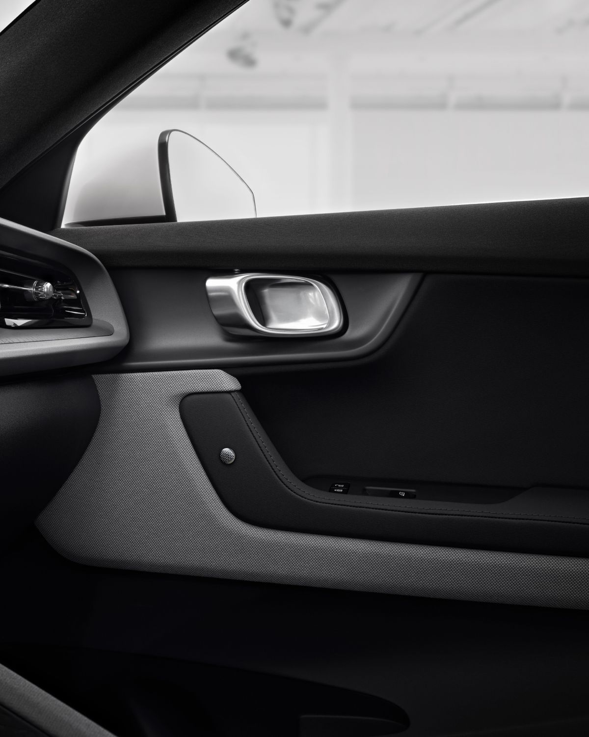 Polestar 2's standard upholstery is far from conventional. The backrests are clad in Embossed Textile, with a geometrical grid-structure-inspired pattern, accentuated by two-tone Zinc or Charcoal upholstery. The plain fabric on the lower part of the seat sets off the patterned backrests, while nubuck badges and thin piping supply the subtle finishing touches.